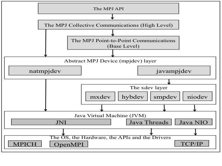 MPJ Express has a layered design that allows incremental development, and provides the capability to update and swap layers in or out as needed. This helps mitigate the contradictory requirements of end users because they can opt to use high-performance proprietary network devices or choose the pure Java devices that use sockets. The MPJ Express design illustrates different levels of the software: the MPJ API, high-level, base-level, mpjdev, and xdev.